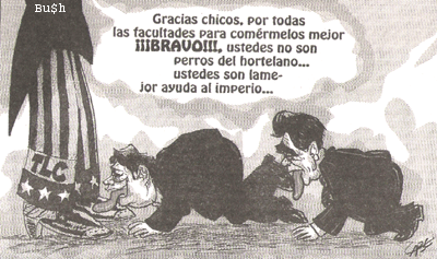 El embajador Peter McKinley me ha hecho recordar todo esto del tiempo circular de mi país al halagarnos de tan soez manera. Porque además, como es una persona que gusta de la sinceridad, ha añadido lo siguiente: “Ha habido por parte del Perú un esfuerzo, en estos últimos años, por resolver los conflictos de las compañías estadounidenses con el gobierno en el contexto del TLC”. ¿Y cuál es el contexto del TLC? ¡El de la jurisdicción internacional! ¡El de la renuncia a ser un país! ¡El de la pretensión de ser el Puerto Rico andino, un estado asociado en sociedad (Guillén)! Y en el caso de las patentes, la riqueza genética de nuestra biodiversidad, ¡lo mismo! No el poder judicial de este casi ex país sino las cortes y los tribunales donde la voz del amo canta como en los discos viejos de la RCA Victor. A Estados Unidos ya no le basta que Montesinos, su agente por muchos años, le arregle a Newmont el lío con los franceses de Yanacocha (como que se lo arregló luego de conminar al vocal Beltrán a entender “la necesidad” de favorecer a los Estados Unidos). Quiere más. Y más tendrá con este gobierno que compite con el de Colombia en la dramática carrera por saber qué perro trae el periódico y cuál las pantuflas y qué otro saluda y hace gracias mientras Bush se toma el café de la mañana y habla con la señorita Rice sobre el proceso de paz del Medio Oriente. |